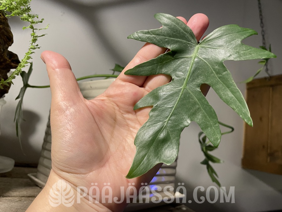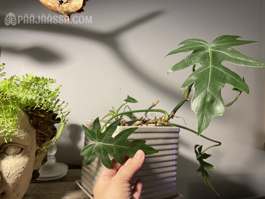 Peikonlehteen on tullut suht kookas uusi lehti ihan viikon sisällä. Luojan kiitos, että viereisellä hyllyköllä olevien peikonlehtien ripsiäisjengi ei ole päässyt tähän vielä kiinni! Tarkkailen tätä nykyään päivittäin. Tällä on kuitenkin potentiaalia kasvaa suureksikin monsteriksi.