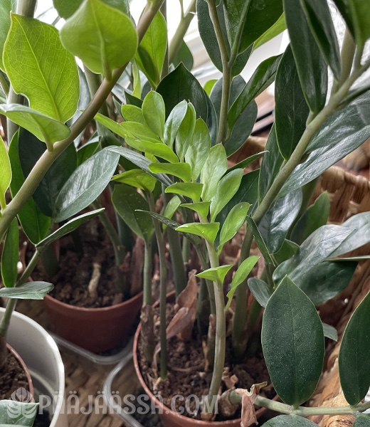 Tässä on joitain huonekasveja, jotka kasvavat todella paljon tällä hetkellä. Niistä oikein näkee sen. Palmuvehka, eli Zamia, on yksi niistä.