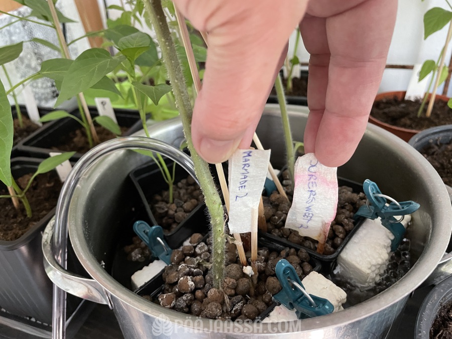 Ainoa ongelma tässä oli, että taimet eivät tahtoneet oikein kestää tuolla vedessä ”paikoillaan”, vaan vesi liikutti ruukut kumoon. Siitä syystä virittelin Finnfoamista tehdyt palaset ruukun reunoihin ikään kuin kellukkeiksi. Muuten hujopit tomaatintaimet olisivat kaatuneet kumoon. Kevytsora lähti myös ruukusta vähän omille teilleen kun vesiraja tuli aika ylös tässä väliaikaisessa viritelmässä ja ruukku oli todella kevyt. Tämä oli siis väliaikaiseksi tarkoitettu viritys ja tomaatti saisi myöhemmin paremman kasvuastian.
