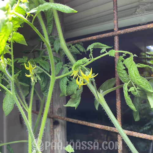 Tomaatti on tehnyt kaikesta huolimatta vähän satoa, ja tarkoitan tällä lauseella, että erittäin vähän satoa – ihan muutaman tomaatin. Tällä hetkellä siinä on enemmän raakileita yhtäaikaa kuin aikaisemmin on ollut, kun se oli tuolla keittiössä seinustalla. En tiedä tarkalleen mikä asiaan vaikuttaa, mutta varmasti myös se luonnonvalokin. Nämä kuvassa olevat tomaatit on syöty jo ajat sitten!