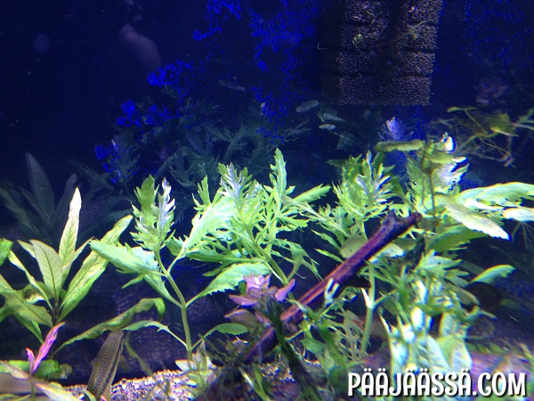 Hyllystä lähempi kuva… keskellä kasvaa Hygrophila difformis, eli liuskavesitähdikki. Se on kyllä pohjassa asti, mutta tuli ulos altaasta. Tässä linkki vanhaan blogikirjoitukseen, jossa näkee kasvin vähän paremmin. (kännykkäkuva)