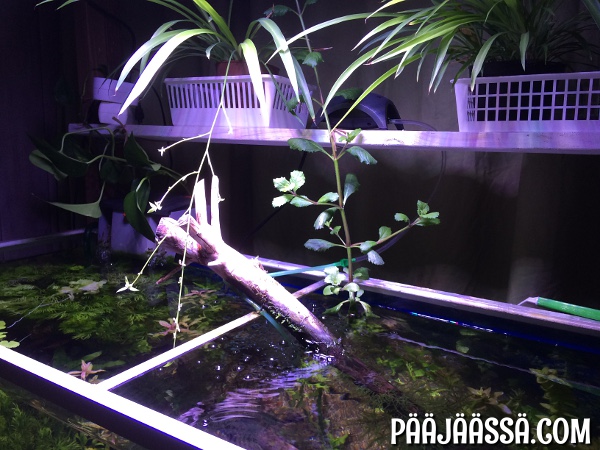 Olen viritellyt akvaarion ulkopuolta tässä viimeisen viikon aikana. Aiemmin akvan takana valaisimelle rakennetussa puutelineessä oli hylly, johon olin laittanut mm. rönsyliljoja. Otin hyllykön pois ja virittelin takaseinällä raudoiturautapalasen, johon saan sitten kultaköynnöksen kiipeämään. Kultaköynnös nimittäin viihtyy tuolla! Kasaan jossain vaiheessa videon, jossa näistä on sitten enemmän. Minullahan siis on videita jo nyt tuubiin laitettuna. Hyvin vaatimattomia ne ovat, en ole ammattilainen näissä hommissa kuitenkaan 🙂 Mutta takasin asiaan…Tässä kuitenkin altaasta kuva ennen virittelyä (24.8.2016 kännykkäkuva)