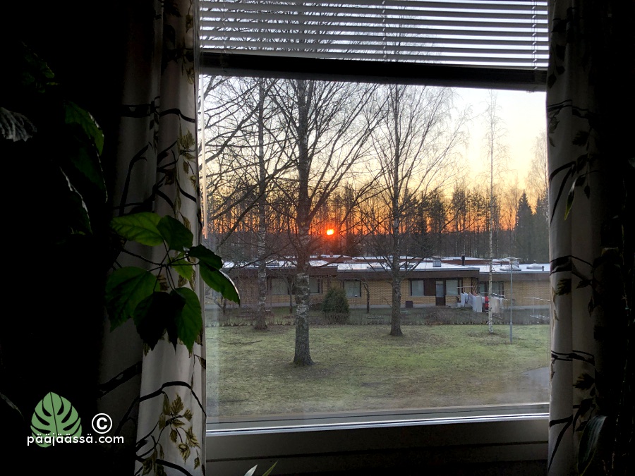 Koristelun jälkeisenä päivänä istuskelin sohvalla omia askareitani tehden, ja aurinko alkoi paistaa puiden lomasta, ja suoraan joulukuuseen! Huh mikä näky se olikaan. Kuusi oli kuin se olisi ollut täynnä jalokiviä. Näky oli hämmentävä. En muistanut yhtään, että tuohon kohtaan olohuonetta voi tällaiseen aikaan paistaa aurinko. Aurinko on niin matalalla tällä hetkellä, eikä puissa ole lehtiä peittämään sitä, niin kuin kesällä on.