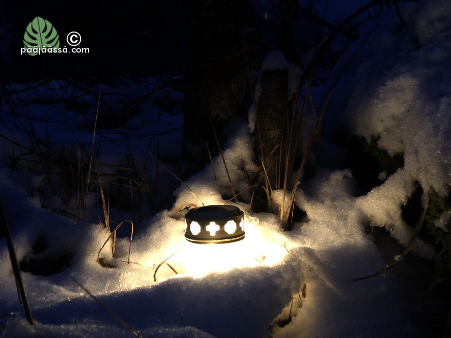Pitää vielä kehitellä jokin suoja kuusen jalalle, kun se näkyy ikävästi. Ehkäpä nuo lahjapaketit olisivat sopivia tarkoitukseen. Nehän vähän niin kun kuuluvat kuusen juurelle. Lyhdyt peittävät jakkaraa, jonka päällä kuusi seisoo. Sohvalla kun istun niin ne eivät näy. Kuusen koristelusta sen verran, että tänä vuonna en ostanut mitään uusia koristeita, vaan nämä miellyttävät minua nyt niin paljon, että en usko tarvitsevani enää muita koristeita. Kuuseen pääsi tänä vuonna taasen edesmenneen, rakkaan koirani, Foxyn nimilaatta