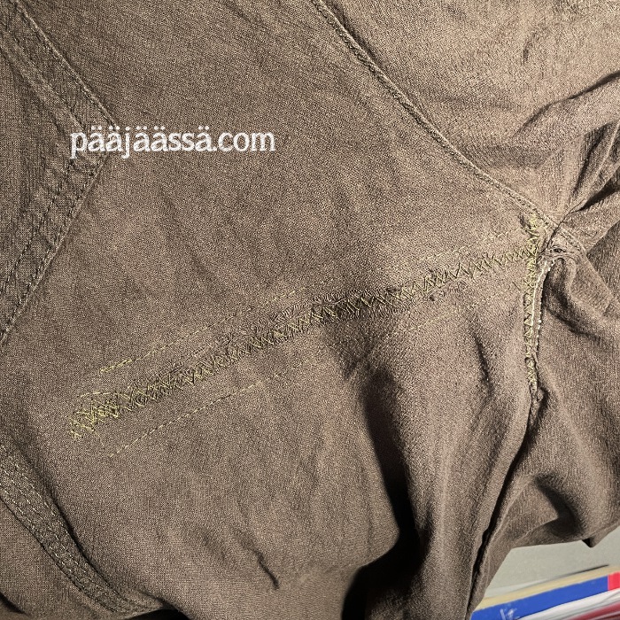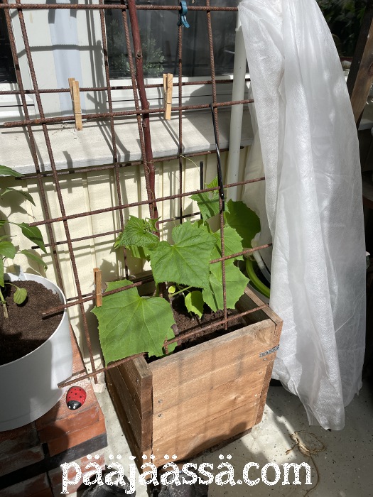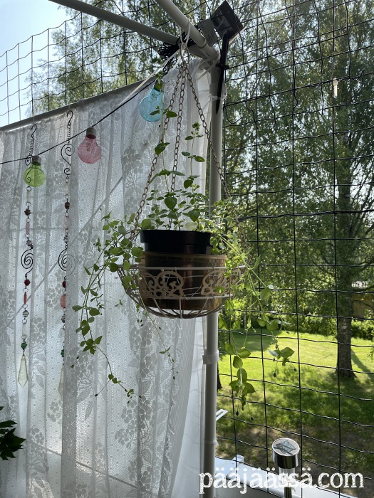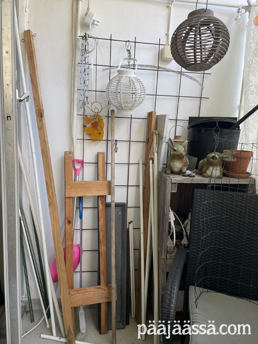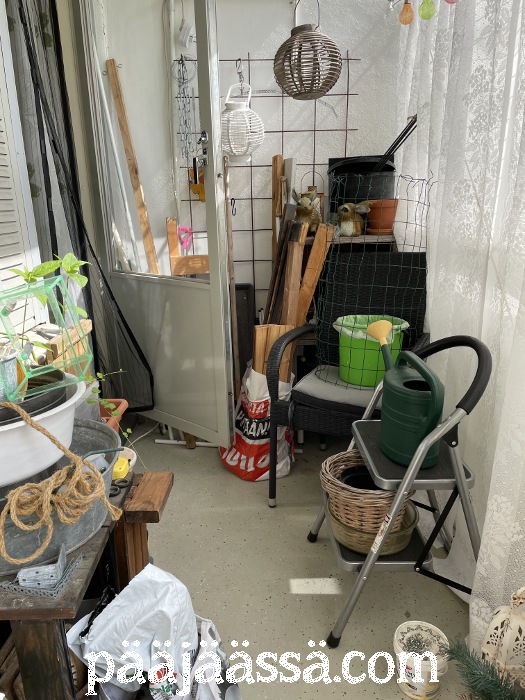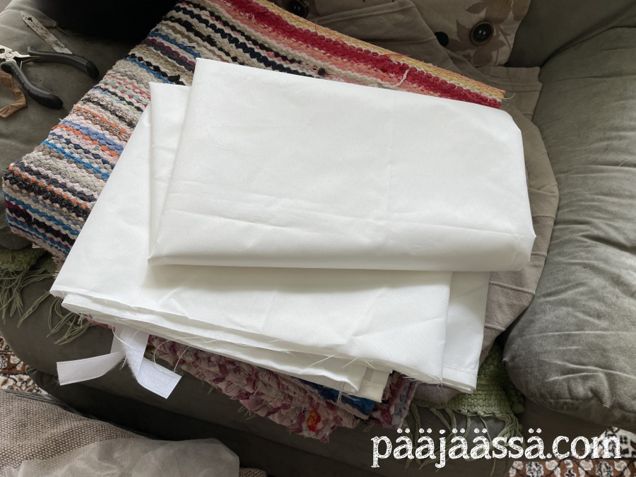 Parvekkeessa on vielä tekemistä. Pitää ommella pavilingongin seinämäkankaasta lisäsuoja parvekkeelle. Pavilijonki on korkeudeltaan 2 metriä, ja sen yläpuolelta pääsee paistamaan aurinko suoraan siihen osaan parveketta, jossa haluaisin oleskella. Oleskeluosan on oltava suojassa auringolta ja sateelta, jotta voin käyttää sitä siihen tarkoitukseen, mihin olen sen suunnitellut.