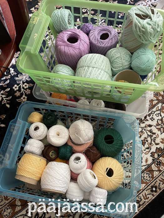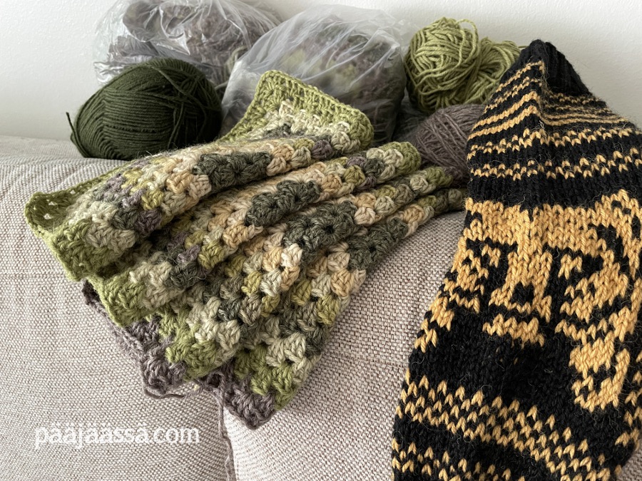 Miten niin keskeneräisiä projekteja paljon? Tässäkin on vain viisi erillistä projektia keskeneräisinä. Se on hyvä kun ne ovat tuossa vieressä niin jatkan aina sitten jotain kun siltä tuntuu. Älä hämäänny tästä sohvan selkänojalla olevasta kasasta, vieressäni on vielä pari pöytää, jossa on lisää käsityöprojekteja! Nyt kun saisi muutaman maaliin, niin sitten ne ideat on toteutettu ja tehty. Ne voi sitten siirtää ajatuksista TEHTY-laatikkoon.