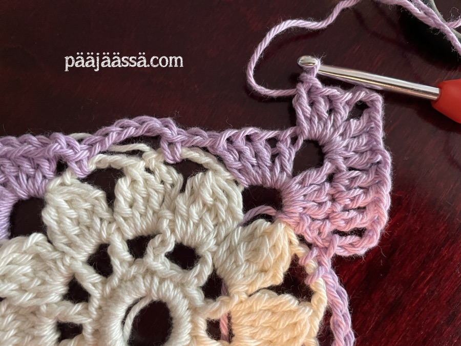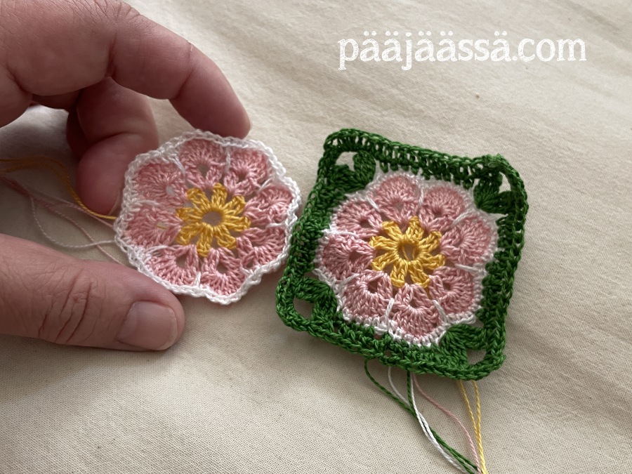 Tein joku aika sitten ihan uskomattoman löydön paikallisen roskalavan kautta. Joku lahjoitti muovikassillisen pitsilankoja. Olen aina halunnut tehdä pitsilangoista jotakin. En siis ole virkannut koskaan pitsilangasta mitään. Nämä ovat onneksi vielä vähän paksumpia virkkauslankoja, mitä virallinen pitsilanka on, mutta se on pelkästään parempi niveliäni ajatellen. Tein heti koekappaleet afrikankukkasesta. Pitäisiköhän minulla olla toisenkokoinen koukku? Käytin kokoa 2mm.