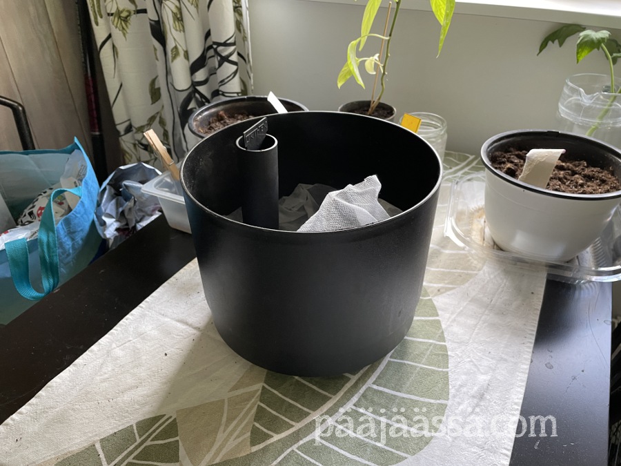 Oli tarkoitus istuttaa sisällä kasvatettu paprika mustaan altakasteluruukkuun, mutta päätin sittenkin viedä paprikan ulos kasvamaan. Mitähän tähän sitten laittaisi? Meniskö joku kultalöynnös tällaiseen tai vaihtaisiko neulavehkan tähän? Altakasteluruukuissa on jokin jippo kuinka niitä tulisi käyttää, että kasvit viihtyisivät niissä. Pitää ottaa asiasta selvää ennen kuin siihen istuttaa mitään.