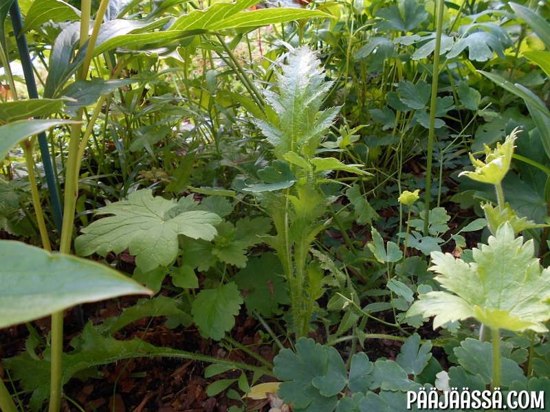 Tässä on yksi kasvi jonka yritän ehdottomasti pelastaa, jos vielä näen sen kukkapenkin reunalla. Se on itseni siemenestä kasvattama kamtšatkanmaksaruoho. Sain siirrettyä edellisestä puutarhasta yhden pienen taimen äidin pihalle, ja se onnekseni lähti kasvamaan. Kukkapenkki on omasta toimettomuudestani ollut muutaman vuoden huonolla hoidolla, niin täytyy vaan toivoa, että maksaruoho löytyy vielä siitä.