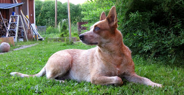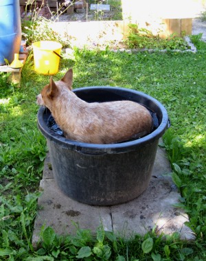 Tarha-alpi on tehnyt myös nuput, jotka eivät ihan vielää ole auenneet. Oikeanpuoleisessa kuvassa puutarhavahtini käy uimassa silloin tällöin kun kuuma tulee. Kyseessähän on Foxi-hauveli (australian karjakoira).