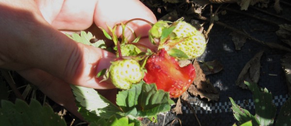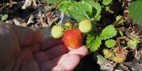 Mansikka on kypsyttämässä jo ensimmäisiä marjojaan 🙂