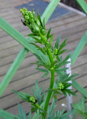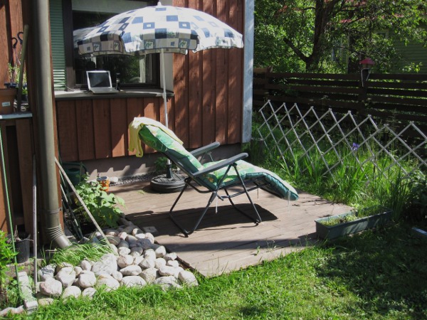 Siinä on kasvamassa persilijaa, sitruunamelissaa ja timjamia. Huomaatteko oikeassa laidassa olevan kierukan? Se on hyttyskierukka. Jostakin kumman syystä niiden paketeissa tulevien telineiden kohtalo on olla aina kurtussa tai tallottuna jossakin, niin päätin tehdä tällaiset telineet niille. Epäilen, että kukaan haluaa näiden päälle astua! Muutenkin, kun piha on suuri, ja hyttyskiekkoja tarvitaan useassa paikassa, voi tällaisilla omilla viritelmillä olla käyttöä. Hyvin yksinkertaista: puupala, joka on noin hyttyskiekon kokoinen ja sen nurjalta puolelta vasaroidaan ohut naula läpi. Voilá !