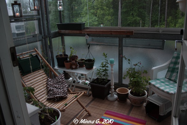 Oikeanpuoleisessa kuvassa näkyy parvekelaatikkoistutukset ja minulla on tuollaisia laatikoita kaksi kappaletta. Koska niiden pohjissa ei ole reikiä (tarkoituksella), niin laitan krassit omiin ruukkuihinsa kasvamaan. Uskoisin että niitä on siten hieman helpompi hallita, ja voin vaihtaa sinne keskelle vaikka jotakin muuta jos mieleen juolahtaa.