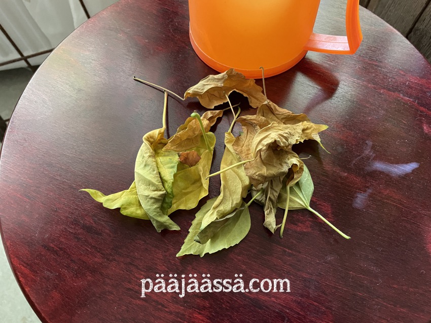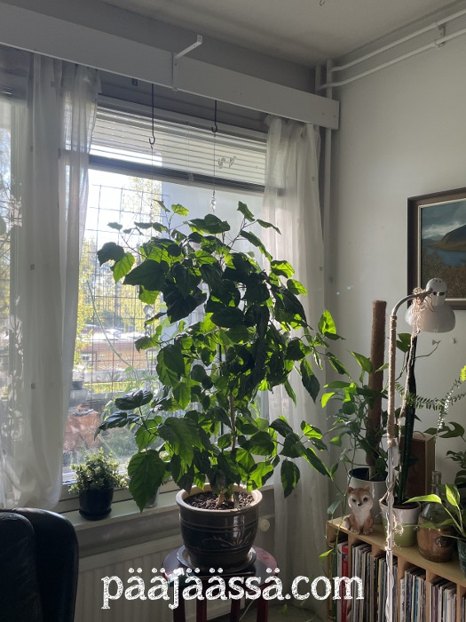 Kiinanruusua pitäisi vähän leikata vielä. Se on kasvattanut alas aika pitkän oksan, ja se kasvaa vaan. Vettäkin se hörppii aika paljon. Sitä täytyy kastella ainakin kaksi kertaa viikossa jo. Toisaalta antaa sen pudotella vaan lehtiä, niin se hieman uudistuu. Olen joskus ihan nyppinytkin tuosta lehtiä. Mitä enemmän lehtiä, sitä enemmän se juo.