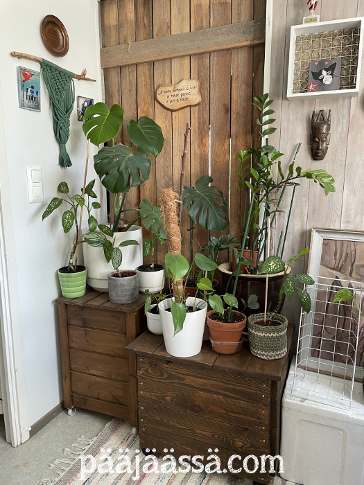 Ja siitä se ajatus sitten taas lähti karkuun. Ettei olohuoneen kasvinurkkauksesta tulisi niin levotonta, päätin siirtää makkarista kirjalaatikon olohuoneeseen kukkapöydäksi. Kevennän makkarin nurkkausta sitten vähän. Puulaatikko on entinen arkkupöytä, jonka olen kääntänyt kyljelleen. Sain mahtumaan sen sisälle kaikki kirjat, kun minulla ei varsinaisesti ole kirjahyllyä. Sellainen saattaisi kylläkin tulla kyseeseen jossain vaiheessa. Minulla on tarkoitus laittaa puulaatikkoon yksi hylly, joka tuossa onkin jo valmiina. Pitää vaan ruuvata sisäreunoihin puurimat, jonka päälle tämä hylly sitten menee. En ole vielä päättänyt mitä tämän kanssa teen, mutta se saa nyt väliaikaisesti mennä olohuoneen nurkkaan kukkapöydäksi.