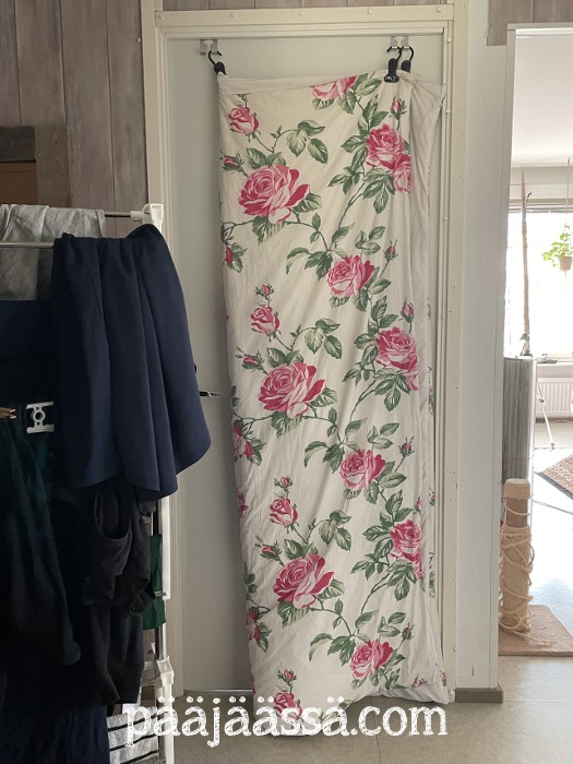 Pesin tänään aamupäivästä peittoni, jonka kanssa nukun. Laitoin sen koneeseen pussilakanoineen päivineen. Ei tarvitse sitten hikoilla sen kanssa myöhemmin. Peitto pääsi kuivumaan työhuoneen oven ylälaidassa oleviin naulakoihin. Se on juuri ja juuri sen pituinen, että helma ei osu maahan. Onhan lattia toki puhdas, että ei siinä mitään. Käyn kääntelemässä peittoa välillä, jotta se kuivuisi tasaisemmin ja nopeammin.