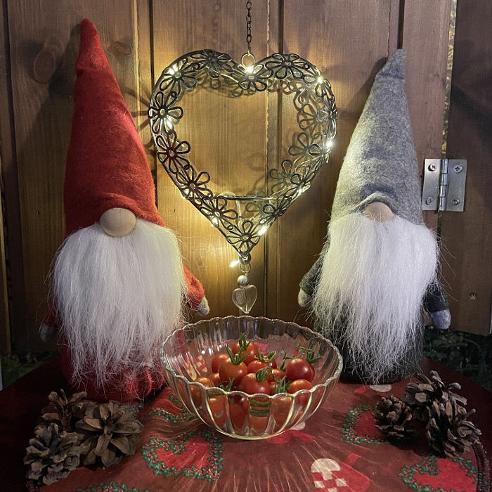 Otinpas vielä jouluisen kuvan tomaateista tonttujen kanssa!