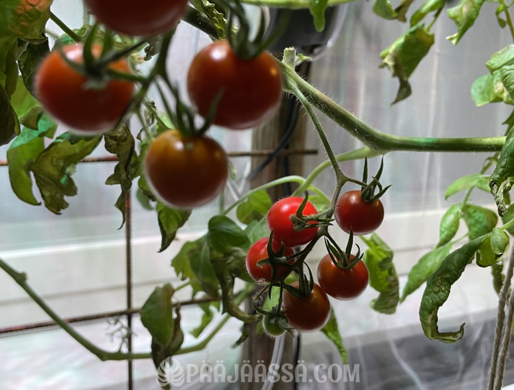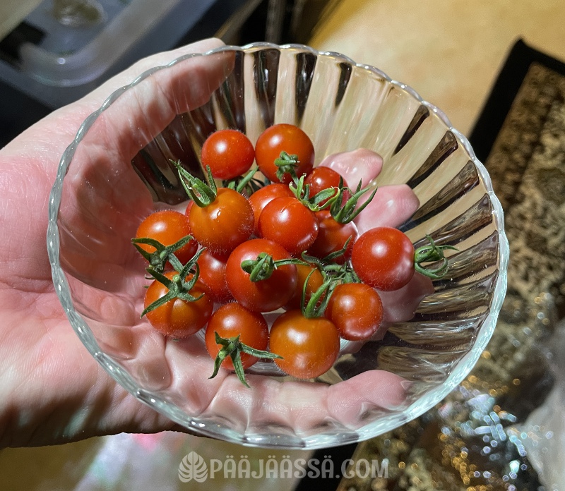 Vesiviljelyssä oleva tomaattini näytti hetkellisesti jopa joulukuuselta, kun se oli kypsyttänyt kourallisen pikkutomaatteja. Saan sitten lähipäivien aikana syödä omaa satoa, mikä on todella luksusta näin talvella. En vain uskonut, että tämäkin olisi mahdollista, mutta niin se vaan tuottaa tomaatteja koko ajan.
