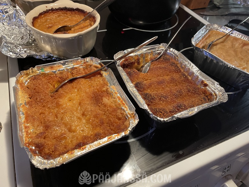 Tein hyvissä ajoin esivalmisteluja joulua varten. Porkkana- ja lanttulaatikot olivat paistamista vailla valmiita. Paistoin ne sitten suoraan joulupöytään kun menin vanhemmilleni. Ei ole mitään järkeä paistaa niitä päivä etukäteen ja sitten lämmittää uudelleen. Samoilla lämmöillä meni nyt ja olivat vielä kuumia, kun vein pöytään.