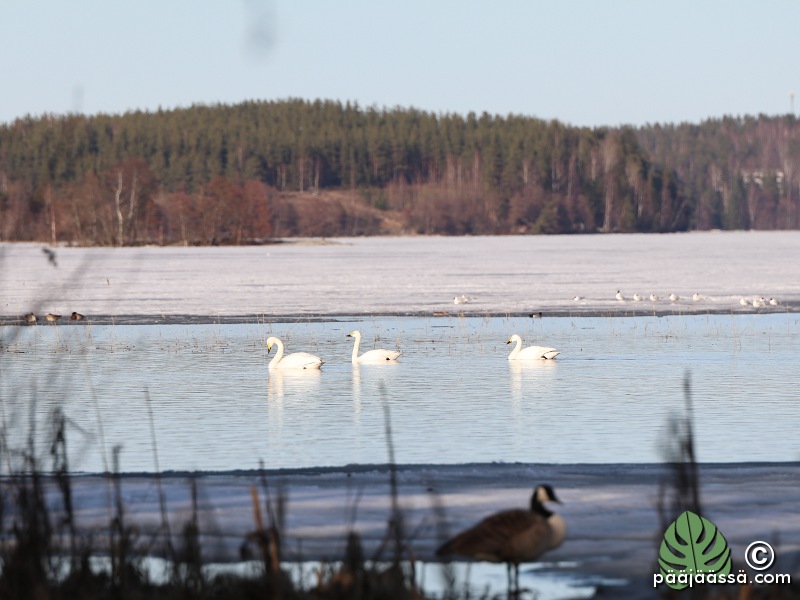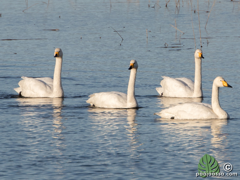 Joutsenet olivat jälleen järvellä! Tai osa siitä määrästä mitä paria päivää aikaisemmin oli kun kävin paikalla. Nyt niistä alkoi jo ymmärtämäänkin jotain. Kävin tietysti lukemassa BirdLifen sivustolta vähän tietoa joutsenista. Vieläkään ei näkynyt niitä pikkujoutsenia, joita haluaisin bongata. Paikalla oli pelkästään laulujoutsenia. Onneksi ne ovat niin suurikokoisia, että niistä saa otettua kuvia, vaikka eivät ihan rantakaislikossa olisikaan. Tummempi yksilö on edellisen vuoden poikasia. Tämä taitaa olla pariskunta.
