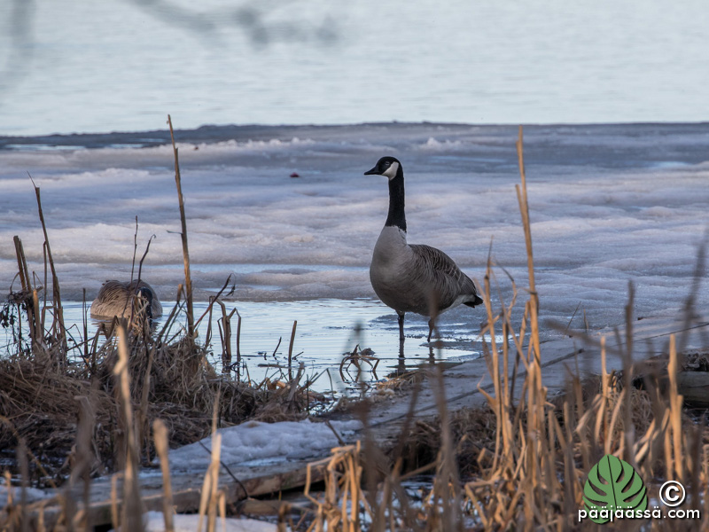 Jääpeite alkoi olla jo suhteellisen kaukana rannasta ja osa joutsenista oli mennyt sen päälle lepäilemään ja puhdistamaan sulkiaan. Joku niistä tarkkaili aina tilannetta. Olihan meitä kaksi valokuvaajaa samalla tasolla kui ne.