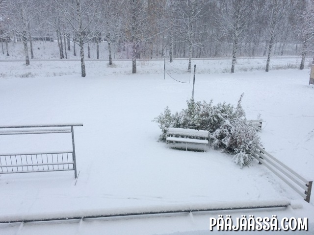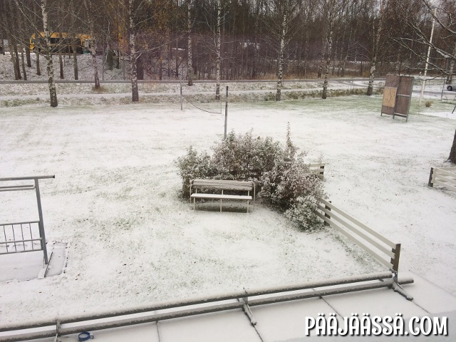 Oli sinänsä huvittavaa tuo lumentulo, kun edellisenä päivänä talkkari ajoi vielä nurmikkoa, tai keräsi lähinnä pudonneita koivunlehtiä… seuraavana päivänä pihalla on 10cm lunta!Noh, äkkiä ne lumet sitten sulivatkin pois… (pari päivää myöhemmin)