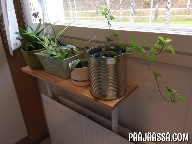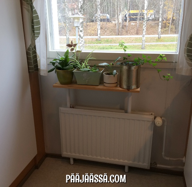 Olen välillä miettinyt, mitenkä saisin tuohon keittiön ikkunan alle hyllyn, johon voisin laittaa vaikka yrttejä kasvamaan. En halunnut porata seinään mitään reikiä, niin kappas kummaa; patterin välissähän oli sellaiset ”kennon” näköiset rakoset, niin sain tällaiset ruuvattavat jalat menemään siitä läpi. Tuo viritelmä tuossa kuvassa kestää ihan ilman mitään tuossa pystyssä! Laitoin pienen palan sanomalehteä toisen jalan ja patterin väliin niin hylly ei edes heilu. Samaa tarvitsee varmaan kokeilla tuolla makkarin puolella jossain vaiheessa! Pitää vielä maalata tuo hylly, kunhan kerkee.