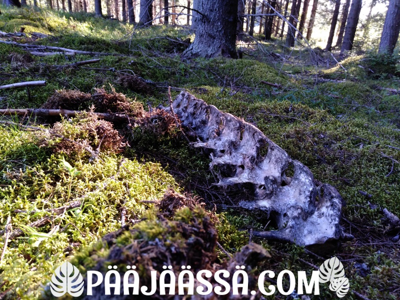 Löysin tästä metsästä vuosi sitten raadon, jota kävin myös tällä kertaa tarkastelemassa. Se oli koluttu aivan puhtaaksi mutta luuranko oli edelleen siellä, missä se oli vuosi sitten. En osaa sanoa mille eläimelle tämä kuuluu, mutta ihan pieni se ei ollut – mahdollisesti peura. Olisikohan se jäänyt auton tönäisemäksi, kun tuossa metsän vieressä on maantie?