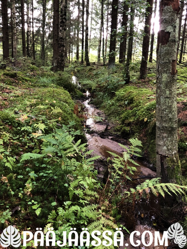 Keskellä metsää kulkee puro, jonka reunamat ovat myös sammalilla koristellut.