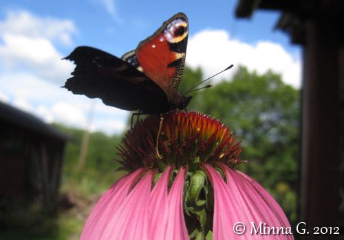 Piha / Puutarha / ParvekeKaunopunahattu eli punahattu (Echinacea purpurea) kukki ensimmäistä kertaa tänä vuonna! Istutin taimet maahan 2010, ja luulin niiden myös kuolleen. Nyt sitten… HUH! Kylläpä tekee kukkia, ja loppua ei näy! Kun punahattu on täydessä kukassaan, se on erittäin ”herkän” näköinen alaspäin kääntyneineen terälehtineen. Halusin myös saada perhosia vierailemaan puutarhaan (harrastan valokuvausta), ja näistähän ne oikeastaan pitävät erittäin paljon 🙂