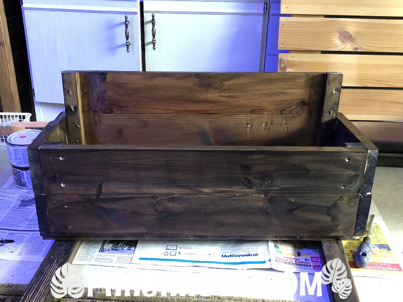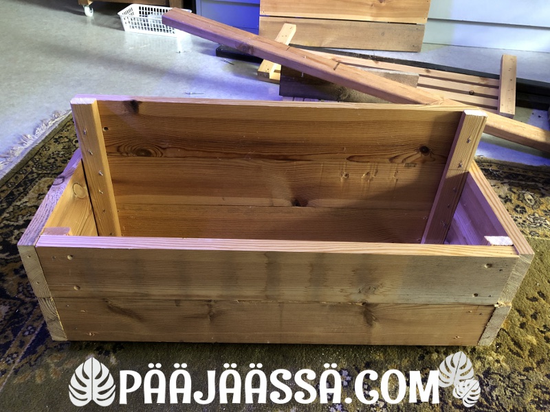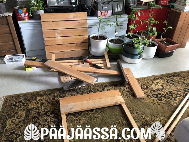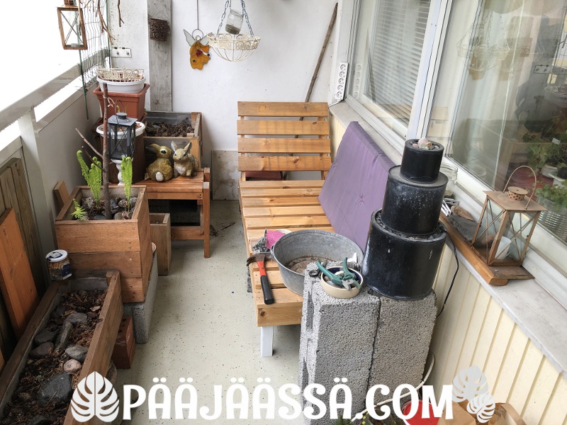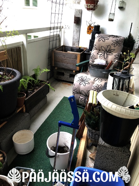 Sain roijattua puusohvan paikoilleen. Sen päälle voi nyt laittaa vähän kaikkea väliaikaisesti ja sisälle pikkutavaraa. Puusohvan tavaratila ei kestä mitään älytöntä painoa, eli kiviä ei ole tarkoitus jemmata sinne lainkaan. Keräsin kaikki tukikepit ja muutaman tyhjän ruukun puusohvan sisään piiloon. Laittelin joitain muita tavaroita väliaikaisesti sen päälle, niin pääsen liikkumaan tuolla parvekkeella ja jatkamaan siivousta.