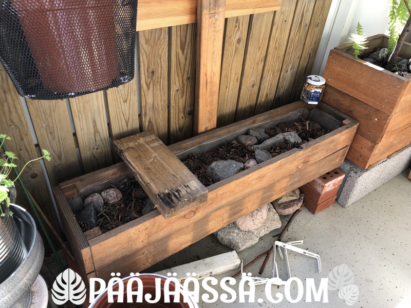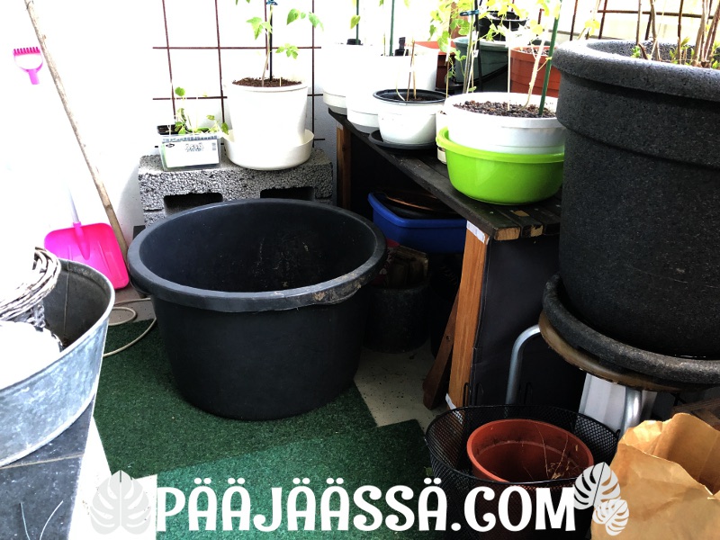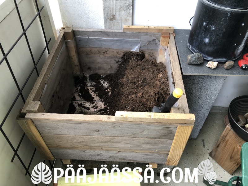 Innostuin paljuasiasta nyt niin paljon, että päätin vielä siirrellä sen kohdalleen. Sehän osui kuin nappi silmään! Vielä kun laittelisi paljun takana olevan puulaatikon Leca-harkot pystyasentoon laatikon alle, niin parvekeovikin saattaisi avautua vielä vähän enemmän. Sitten olisi oikein täydellinen juttu. Ja tarkemmin kun ajattelen, niin taidan jättää tuon oikeanpuoleisen harjateräsverkon sittenkin paikoilleen tuohon kohtaan, missä se nyt on. Noniin, eiköhän tässä ole jo hikisistä hommista tälle päivälle ihan tarpeeksi.