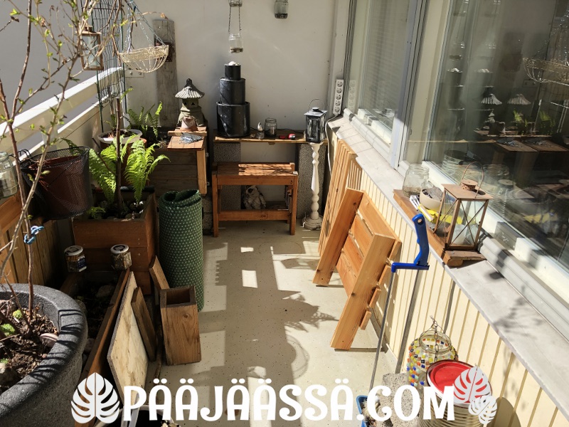 Ajattelin myös irrottaa molemmat parvekekaiteeseen kiinnitetyt sisemmäiset harjateräsverkkopalat pois. Jos laittas ne vaan toiseen kohtaan. Pakko myös miettiä, että kuinka paahteinen tuo parveke tulee olemaan. Minulla on hommattuna joltain vuodelta pavilijongin seinämä, jota voisin hyödyntää nyt tässä hommassa sitten. Ja löytyy pavilijongin runkoakin sen verran, että siitä voisi rakentaa jonkunlaisen kehikon, mihin seinämän saisi kiinni. Olisi kivaa pystyä viettämään parvekkeella aikaa, vaikka sataisi vettä. Kirjoitan tästäkin asiasta vielä erikseen, kunhan olen saanut homman tehtyä – jos saan.