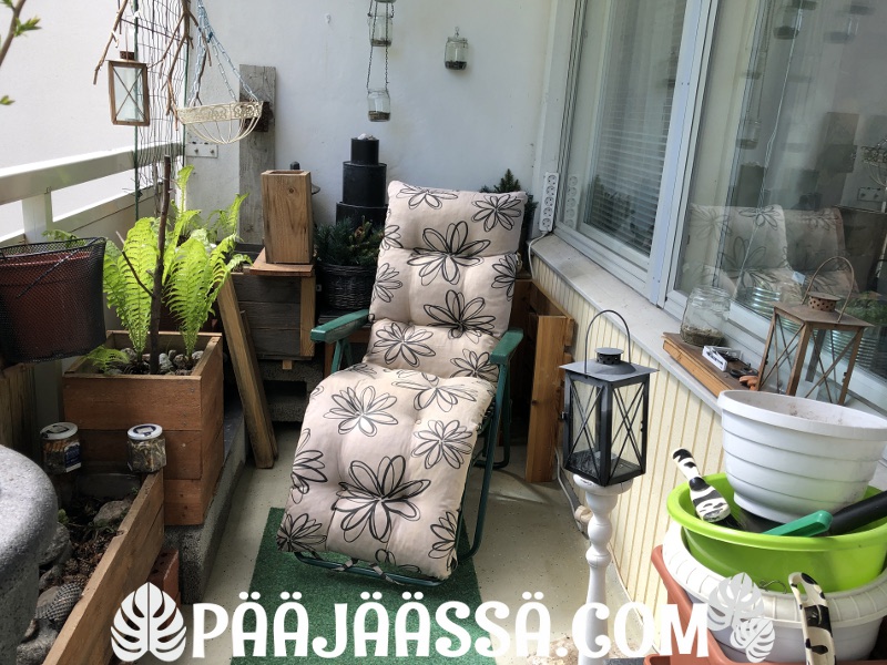 Olen aika tarkkaan miettinyt parveketta ja millaisen siitä haluaisin. Taas tuli uusi elementti (puusohva) sinne viemään tilaa, mutta tervetullut elementti kuitenkin. Nyt epäilen, että kummitädin tuoli ei enää mahdu sinne mihinkään. Se ei nyt maata kaada, mutta jos palju ei mahdu, niin se kaataa! Sainkin tässä sohvalla istuessani idean testata miten palju näkyisi tähän sohvalle, jos ovi on auki. Todellakin mallailen sitä vielä kyseiseen kohtaan!