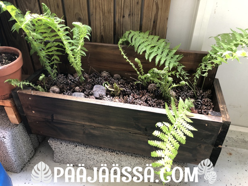 Olen aikeissa tuoda vielä lisää saniaisia parvekkeelle, kunhan saan niitä vaan kaivettua vanhempieni pihalta. Saniaisalueen siistiminen on kuitenkin tarpeen joka vuosi kun se leviää niin paljon. Kyseessähän on kotkansiipisaniainen. Ne ovat näin pihalta kerättynä todella kestäviä kasveja, jotka talvehtivat myös parvekkeella. Ainakin omat ovat talvehtineet. Kaivoin tosin isosta puulaatikosta kaikki pois ja viskaan ne hyötyjätepisteelle muiden multaromppeiden kera.