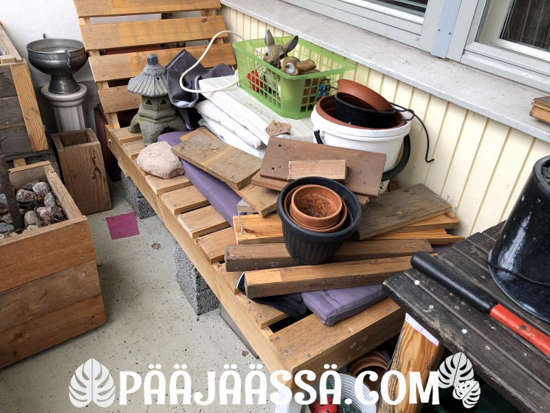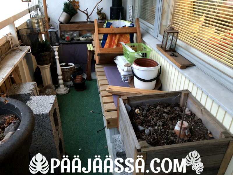 Piha / Puutarha / ParvekeParveke on ihan hyrskynmyrskyn! No mutta niinhän se on joka vuosi – yleensä. Tällä kertaa astetta pahemmin. Viime vuosi oli minulle todella rankka koiran, ja vielä juuri ennen joulua kissan poismenon vuoksi. Minua ei ole huvittanut oikein tehdä mitään, mistä normaalisti olen saanut iloa. Olen aina laittanut parvekkeeni kuosiin ”lemmikit edellä”. Nyt ei ole enää lemmikkejä. Mutta on taas niin maan perusteellisen suuret suunnitelmat! Sehän se aina ”pelastaa” 😀