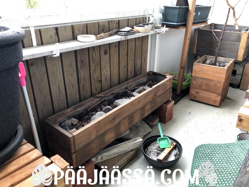 Takaseinällä ollut pitkulainen saniaislaatikko laitetaan takasin siihen missä se on ollut alunperinkin. Saniaiset viihtyivät siinä parhaiten – ja saivat sadevettä. Sekin on varjopaikka, mutta ikkunasta heijastuu siihen sopivasti valoa aamupäivällä ja vähän iltapäivälläkin.