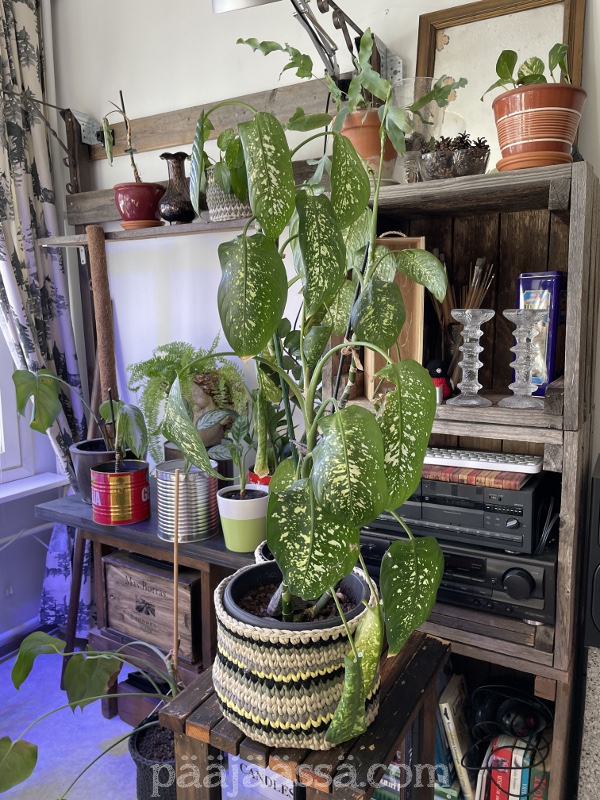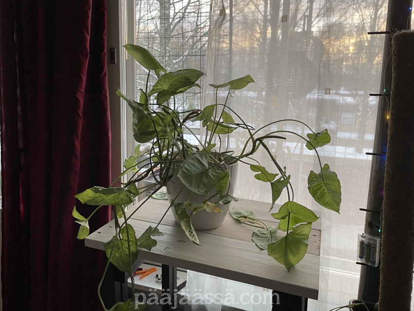 En ole vielä ehtinyt siirtää muulinkorvaa uuteen ruukkuun. Yritän tehdä sen tänään. Se ei nimittäin tykkää olla tuossa umpinaisessa ruukussa, jossa sen sain. Yhtään ei kyllä huvittaisi alkaa sotkemaan taas kun on juuri saanut imuroitua kämpän. Mutta ei kai siinä muukaan oikein auta. Kuva on sen verran vanha, että olen jo ottanut jouluverhot alas! Sen olin hoitanut ajat sitten.
