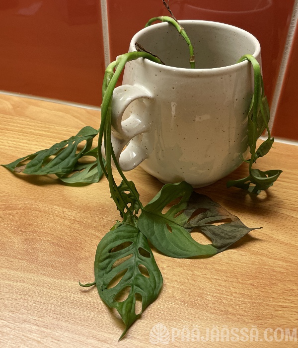 En ole vielä ehtinyt siirtää muulinkorvaa uuteen ruukkuun. Yritän tehdä sen tänään. Se ei nimittäin tykkää olla tuossa umpinaisessa ruukussa, jossa sen sain. Yhtään ei kyllä huvittaisi alkaa sotkemaan taas kun on juuri saanut imuroitua kämpän. Mutta ei kai siinä muukaan oikein auta. Kuva on sen verran vanha, että olen jo ottanut jouluverhot alas! Sen olin hoitanut ajat sitten.