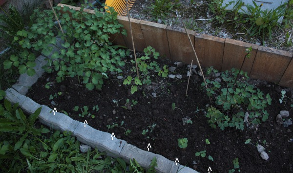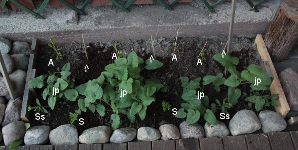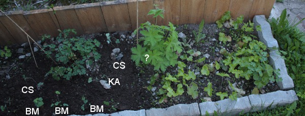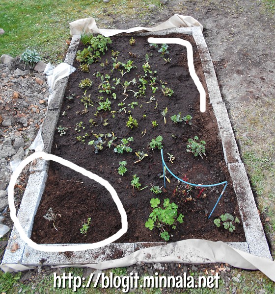 Sain istutettua lähes kaikki haluamani kukkaset, joskin muutama juttu vielä puuttuu. Ympyrän osoittamaan kohtaan olen tekemässä pienen kulmauksen kivikkokasveja varten. Siihen pitää vielä hankkia materiaalia, kuten kiviä ja hiekkaa. Oikeassa ylälaidassa olevan viivan kohdalle tulee siperiankurjenmiekkaa, kunhan pääsen kaivamaan alkuja tuttavani pihalta.