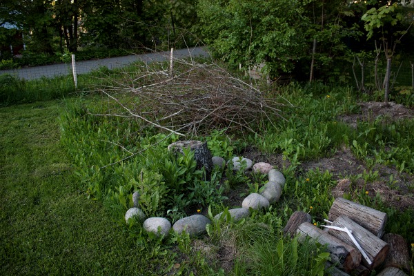 Kävin toisenkin kukkapenkin lävitse, ja kitkin siitä vuohenjuuret pois, tai sen minkä jaksoin. Nyt olisi sitten seuraavaksi alueen siistiminen roippeista, joita kasaantui maankaivuuhommista. Tässä läjä poisvietäväksi…