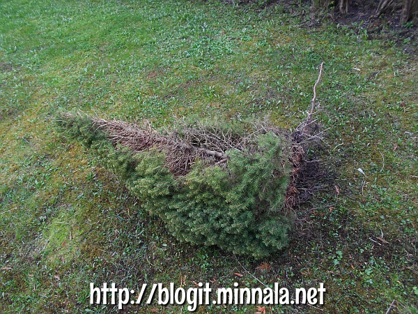 Aiemmassa postauksessa kerroin kartiovalkokuusesta, joka oli hieman kärsinyt, kun äitini oli laittanut sen kukkapenkkiin, niin se lähti kyllä todella helposti maasta ylös. Kyselin eräältä tuttavalta, joka ymmärtää näistä asioista melko paljon, niin hän sanoi juuriston kärsineen aika pahasti. Noh, sehän selittää sitten aika paljon tuon puun kohtaloa. Mutta lupasin viedä sen hänelle, jos hän saisi sen elpymään. Saa sitten itselleen siitä pihakoristeen.