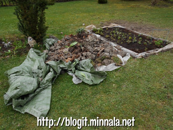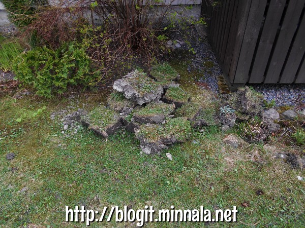 Kun savet on viety pois, käyn vielä hyvin läpi tuon kukkapenkin reunuksen, ja suoristan laatat kohdilleen. Samoin siihen ympärille jää rakoset, jotkä täytän hiekalla ja mullalla. Tänään on todella tuulinen päivä, niin en laita nurmikonsiemeniä siihen vielää. Mutta toivottavasti lähipäivinä saa laitettua, että nurmikko ehtii kasvamaan tämän kesän aikana, eikä ympärys täyty rikkaruohoista!