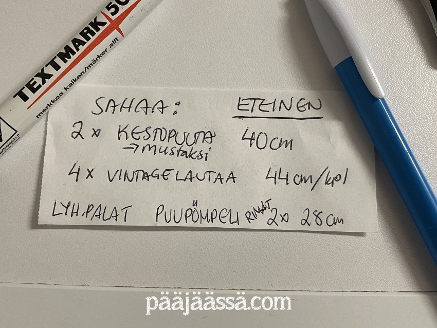 Tervehdyin noin kahden viikon kuluessa flunssasta ja olikin aika käydä järjestelemään tavaroita, koska minulle oli tulossa maailman ihanimmat kisut taas hoitoon. Halusin tehdä pari projektia valmiiksi, jotka ovat olleet odottamassa ties kuinka kauan tekijää. Olin viritellyt vessaan suuren roskiksen, jonka päällä oli hyvä sahailla puupaloja. Purut menevät sitten suoraan roskiin.