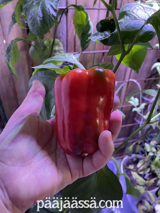 Samaan syssyyn virittelin paprikoille jalustan, kun ne oli saatava lattialta pois. Kuin ihmeen kaupalla varastosta sattui löytymään juuri sen kokoinen hyllylevy, mikä kävi tarkoitukseen. Projekti on vielä hieman kesken, mutta se täytyy tehdä loppuun piakkoin, koska saman alustan päälle tulee myös tomaatti, jos se vielä ehtii. Kuvia sitten taas myöhemmin. Paprikat ovat täynnä kukkia ja alkuja, joten alustalla on siinä mielessä kiire, kun siihen tulee tukinarut. Tämän paprikan poimin 30.10. ja se on nyt syöty. Onneksi paprikan runko ei katkennut tämän paprikan takia. Siksi tukinarut ovat tarpeen.