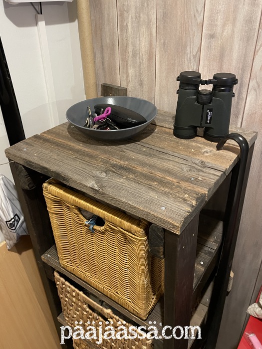 Sain vihdoinkin aikaiseksi sahata eteisen puiseen hyllykköön päällystason vintage-laudoista, joita olen sitä varten säästellyt. Pari vaakatason tukipalikkaa joutui käsittelemään puuöljyllä. Itse tykkään käyttää Supi Saunavahaa, kun se on hajuton ja myrkytön. Olen käsitellyt sillä paljon puupintoja. Laitan hyllyköstä kokonaiskuvan kunhan olen saanut siistittyä alueen esittelykelpoiseksi.