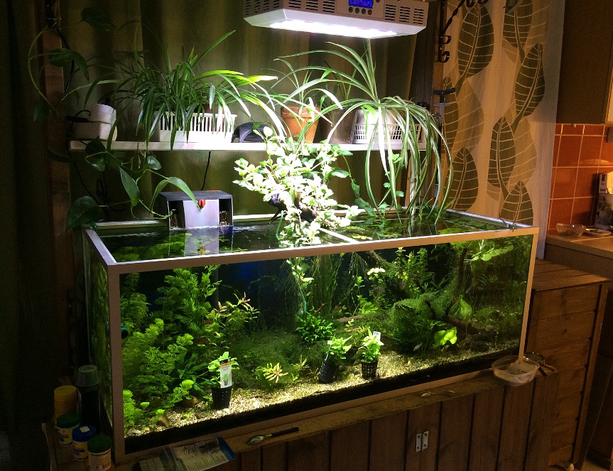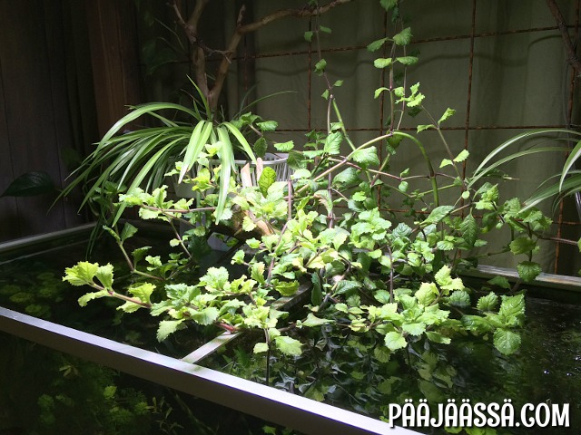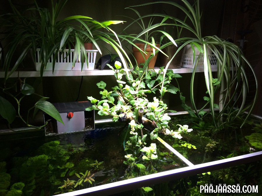 Tämä vessassa oleva peikko on siis pistokas sellaisesta peikonlehdestä, mikä oli siemenestä kasvatettu. Sain pienen taimen alkuvuodesta 2018, ja peikko kasvoi alkuunsa akvaarioni päällä. Siitä tuli sellainen hujoppi, että päätin vielä pätkiä sen, muistaakseni kolmeen pistokkaaseen. Niistä yksi on nyt tässä. Yhden olen heittänyt menemään kun senkin valtasi ötökät.