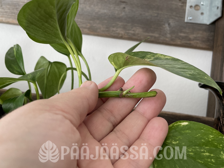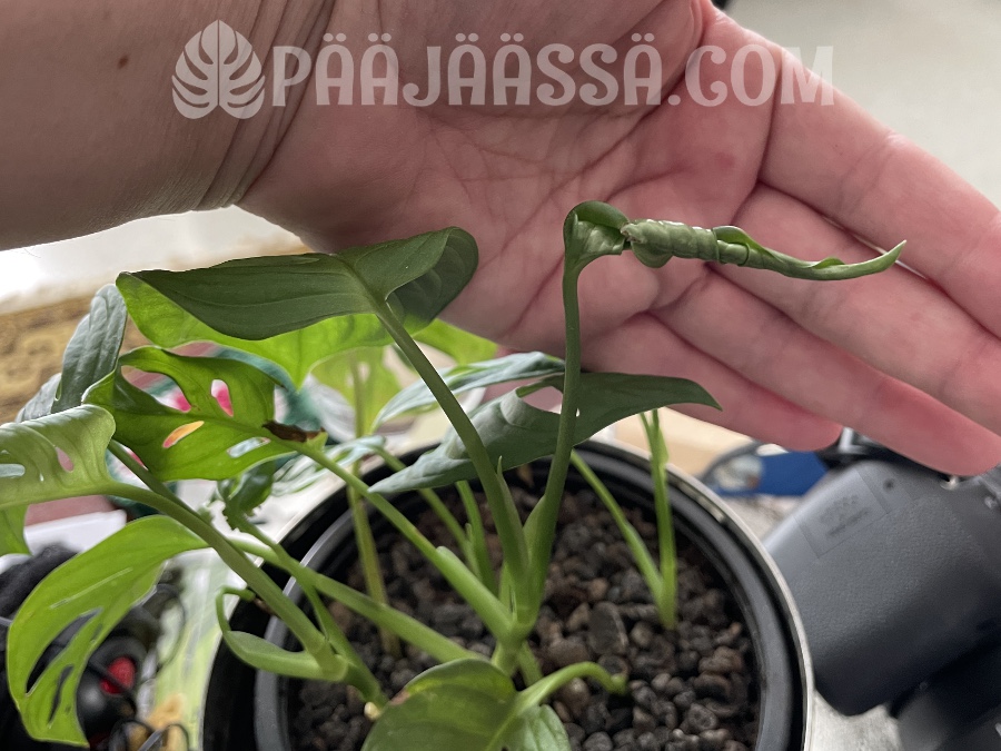Minulla on vielä kaksi peikonlehden pistokasta, joita yritän epätoivoisesti saada kasvamaan. Löysin niin hyvän kasvatusohjeen eräästä videosta, että päätin nyt kokeilla ohjetta heti alkuunsa. Ohjeessa oli, että pitää taimesta pitää katsoa mikä on sen selkäpuoli. Se määräytyy siten, että mihin suuntaan ilmajuuret ilmestyvät kasvin varteen, ja se puoli laitetaan tukikeppiä vasten. Tein nyt niin toiselle peikonlehdelle, minkä istutin uudelleen.