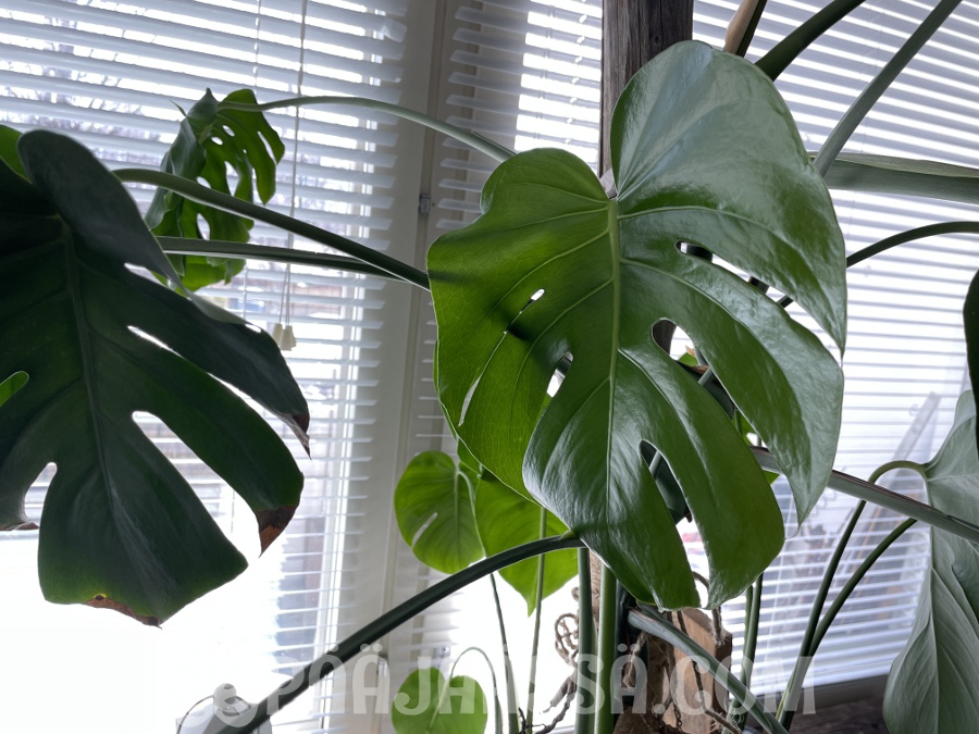Asettelin peikonlehden siten, että sen ilmajuuret ovat tukikeppiä vasten ja kiinnitin sen tiukasti keppiin kiinni sukkahousuista leikatuilla suikaleilla. Arvatkaapas mitä? No näkeehän sen. Peikko aloitti kasvun välittömästi. Tämä uusi lehdenalku on ilmestynyt tuohon muutaman päivän sisällä! Ihan käsittämätöntä. Siksi haluan tehdä tämän saman asian tuolle vessassa riutuvallekin peikolle, että saisin sen kunnolla kasvuun ennen kuin se näivettyy kuoliaaksi. Olohuoneessa on myös yksi peikontaimi, jolle pitää tehdä näin. Sekin on alunperin kait istutettu niin sanotusti väärinpäin. Samasta syystä suurin peikonlehtikin näyttää kamalalta, kun se on väärinpäin istutettu.