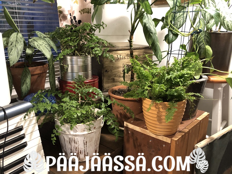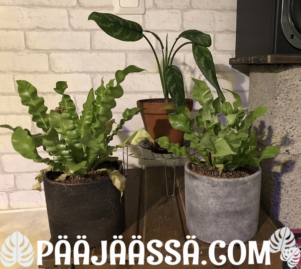 Kävin keväällä törsäilemässä ”saniaisiin”, tai ainakin ajattelin, että nämä olivat saniaisia. Kyseessä oli kuitenkin pesäraunioinen, joka kuuluu kylläkin saniaisten luokkaan. Hoito ei sitten ollutkaan ihan juuri sellainen kuin olin kuvitellut. Olin tappaa ainakin toisen kasvin, kun ilmeisesti kastelin sitä ”ruusukkeen” keskelle. Isoraunioiset ovat tuolla suikun alla jatkuvasti, niin tämäpäs ei oikein pitänytkään suihkuttelusta. Toki sumuttelu on asia erikseen. Löysin ohjeen, jossa sanottiin, että tätä tulee kastella ulommaisten lehtien ulkopuolelta juurelle ja että kasvi pitää sijoittaa valoisaan paikkaan. Molemmat raunioiset ovat olleet nyt etelänpuoleisella ikkunalla paprikoiden ja chilien ruukkujen huoneen puolella. Siihen osuu toisinaan auringonvalokin, ja kasvit ovat lähteneet ihan kunnolla kasvuun. Tällä perusteella en siis laittaisi pesäraunioista kovinkaan hämärään paikkaan, vaan kunnon hajavaloon.
